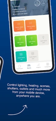 Dyk ned i en detaljeret kontroloplevelse, der organiserer dit hjem logisk efter rum. Udforsk hvert enkelt værelse og styr alle tilknyttede enheder – fra belysning og termostater til persienner – med en overskuelig og responsiv grænseflade. For dem, der søger et mere specifikt overblik, tilbyder appen også en intelligent kategorisering. Du kan ubesværet finde og administrere alle dine aktive stikkontakter eller få et samlet overblik over hver enkelt rumtermostat i hele boligen, hvilket giver dig fuld indsigt og kontrol over dit hjemmets energiforbrug og komfort.