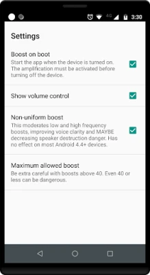 Som en bruger af Volume Booster accepterer du fuldt ud det medfølgende ansvar. Denne applikation er eksperimentel software, og ved at aktivere den fritager du udvikleren for ethvert erstatningsansvar for potentielle skader på hardware eller hørelse. Volume Booster er specifikt designet til at forstærke lydstyrken for musikafspilning, videoindhold og diverse apps – det er altså ikke et værktøj til justering af højttalertelefonens lyd under telefonopkald. Kompatibilitet varierer; nogle enheder understøtter muligvis ikke Volume Booster. Vi anbefaler at afprøve den på din enhed for at bekræfte funktionaliteten. Bemærk venligst, at appen typisk ikke fungerer på enheder med Android 4.2.1-4.3, men forventes at fungere problemfrit på Android 4.4 og nyere versioner, samt på enheder ældre end 4.2.1.